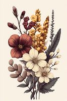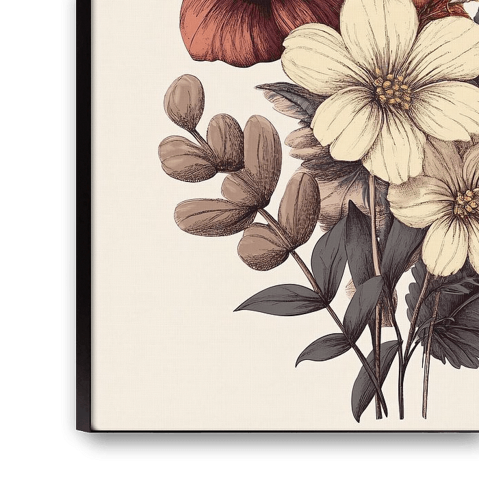 Deze prachtige vintage bloemenillustratie voegt een klassieke en stijlvolle sfeer toe aan elke ruimte. De warme tinten rood, geel, en wit worden prachtig gecombineerd met gedetailleerde bladeren, wat zorgt voor een natuurlijke en elegante uitstraling. Dit ontwerp past perfect in een slaapkamer of kantoor, waar het de ruimte opfleurt zonder te overheersen. Het is ideaal voor liefhebbers van botanische kunst en klassieke decoraties. De subtiele sepia-kleuren geven het een nostalgische uitstraling, perfect om een rustgevend en tijdloos gevoel te creëren.