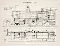 Op deze vintage gravure staat een bouwtekening van een stoomlocomotief die in dienst was van de Hollandsche IJzeren Spoorweg Maatschappij (H.IJ.S.M.)
