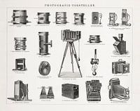 Op deze antieke plaat van rond 1900 staan een aantal historische fototoestellen, lenzen, sluiters en aan de fotografie aanverwante toestellen afgebeeld. O.a. camera's van Zeiss, Kodak en Ernemann.