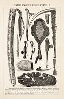 Op deze antieke zwart wit plaat uit ca. 1900 staan een aantal objecten en gebruiksvoorwerpen afgebeeld van indiaanse beschavingen uit Noord en Zuid-Amerika. O.a. Eskimo, Braziliaanse indianen, Vuurland en Guyana.