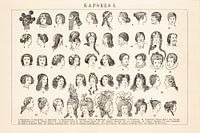 Een vintage gravure waarop een groot aantal historische kapsels staan afgebeeld. Van de vroege oudheid tot ongeveer Lodewijk de 17de.