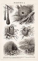 antieke gravure waarop een aantal vogelnesten staan afgebeeld. O.a. de nesten van waterhoen, staartmees en ombervogel.