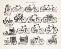 Op deze afbeelding staan zestien verschillende fietsen en rijwielen afgebeeld van rond het jaar 1900. O.a. tandem, motordriewiel en sociable.