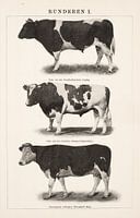 Oude plaat met een drietal Hollandse koeienrassen afgebeeld. Wij zien een stier van het Noord Hollandse veeslag, een stier van het Friese veeslag en een Groningse witkopkoe