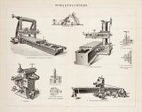 Op deze educatie plaat uit ca. 1900 zien wij naast de bekende handschaaf ook een aantal grote industriële schaafmachines voor de houtbewerking. O.a. tafelschaafmachine en vijlmachine.