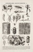Op deze antieke plaat zien wij een aantal voor het bos schadelijke insecten afgebeeld. Hoofdzakelijk kevers en wespen. O.a. Spaanse vlieg, veenmol, dennensnuit-tor en meikever.