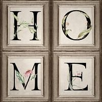Er gaat niets boven thuis, toch? HOME wordt in dit ontwerp gespeld in individuele geïllustreerde letters, met planten en bloemen op een achtergrond van vintage papier. Elke letter is gevat in een vintage houten frame en de frames zijn gerangschikt in een vierkant. Een mooi bord voor in de keuken of hal.