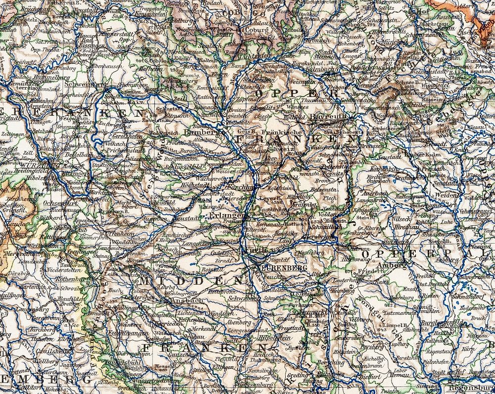 Op deze antieke kaart uit ca. 1900 staat het Koninkrijk Beieren afgebeeld naast een deel van de provincie Beieren. De kaart is in kleur met een schaal van 1:1.250.000