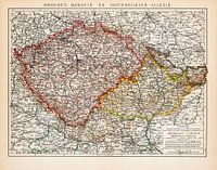 Een antieke kaart uit ca. 1900 waarop het toenmalige grondgebied van Bohemen, Moravië en Oostenrijks Silezië staat afgebeeld. De kaart is in kleur.