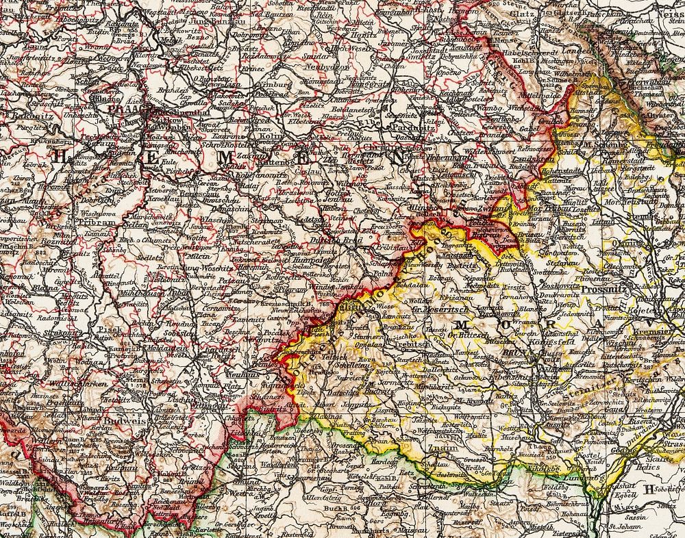 Een antieke kaart uit ca. 1900 waarop het toenmalige grondgebied van Bohemen, Moravië en Oostenrijks Silezië staat afgebeeld. De kaart is in kleur.