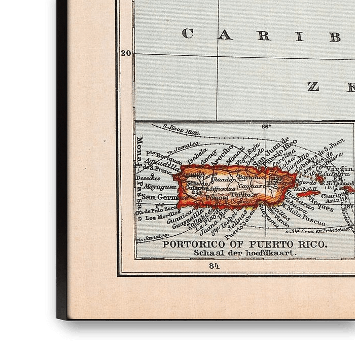 Een antieke kaart uit ca. 1900 waarop Cuba, Jamaica en Porto Rico staan afgebeeld. De kaart is in kleur.