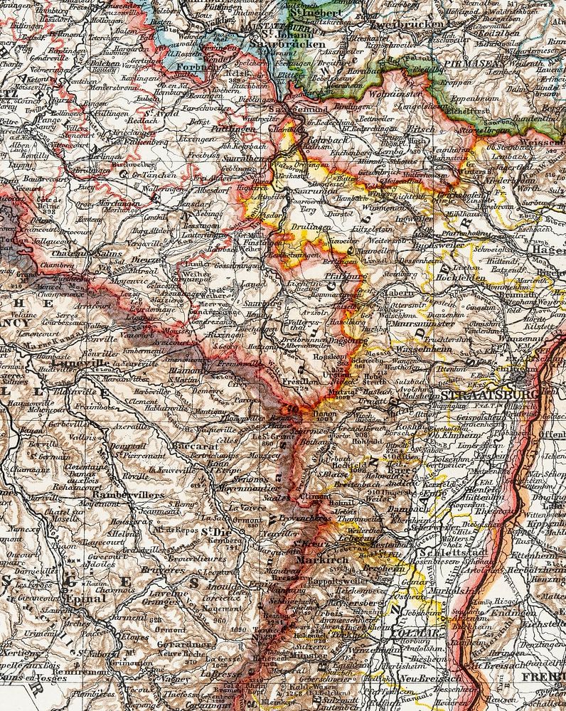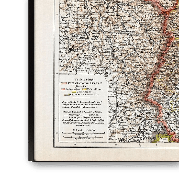 Op deze antieke kaart uit ca. 1900 staan de Duitse deelstaten Elzas Lotharingen en de Beierse Rijnpalts afgebeeld. De kaart is in kleur met een schaal van 1:960.000.