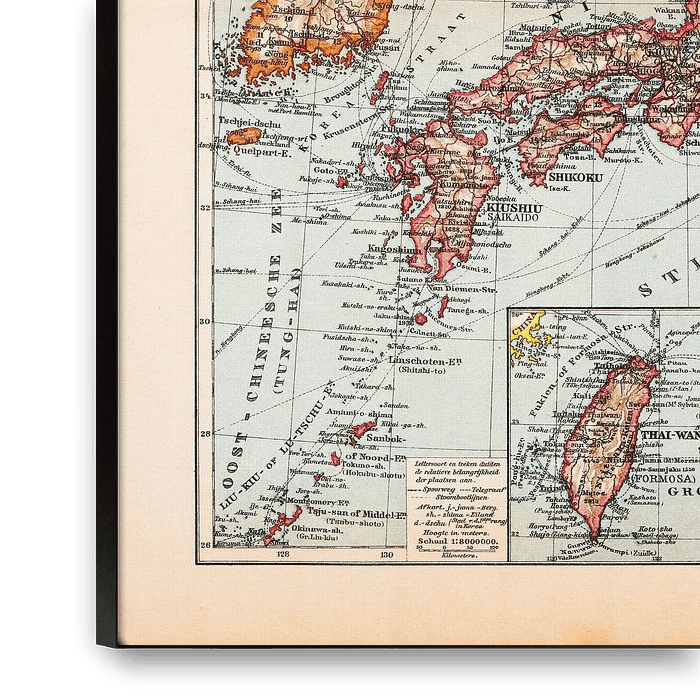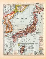 Een antieke kaart van Japan en Korea uit ca. 1900. De kaart is in kleur.