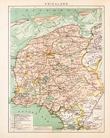 Een antieke kaart van de Nederlandse provincie Friesland uit ca. 1900. De kaart is in kleur.