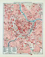 Een antieke stadskaart van de binnenstad van de stad Wenen. Deze plattegrond is uit ca. 1900 en in kleur.