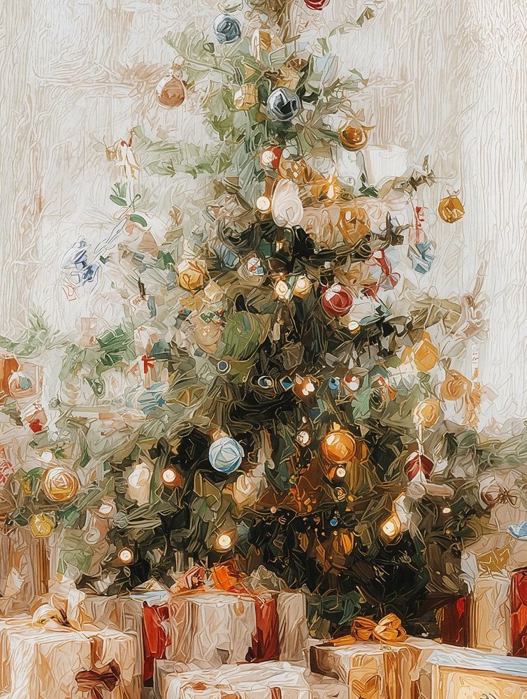 Dit kunstwerk ademt pure kerstsfeer en nostalgie. In een sfeervolle kamer staat een prachtig versierde kerstboom, vol fonkelende lichtjes en kleurrijke kerstballen. Rond de boom liggen zorgvuldig ingepakte cadeaus met strikken, die de spanning en verwachting van kerstavond oproepen. Aan de voet van de boom rijdt een klassieke speelgoedtrein in een cirkel, wat een speelse en nostalgische charme toevoegt. De gordijnen en zachte kleuren in de achtergrond geven het geheel een warme, elegante uitstraling. Het schilderachtige penseelwerk benadrukt de gezelligheid van dit intieme tafereel en roept herinneringen op aan kinderlijke verwondering tijdens de feestdagen. De combinatie van de boom, cadeaus en trein maakt dit werk tijdloos en herkenbaar. Het vangt de magie van kerst in een enkel beeld: licht, warmte en saamhorigheid. Perfect voor iedereen die houdt van klassieke kersttaferelen en een vleugje nostalgie in huis wil halen.