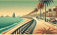 Een zonovergoten promenade kronkelt langs de kust terwijl het kalme water achter een lage stenen balustrade rust. Hoge lampen omzomen het pad en werpen zachte halo's. Een paar bankjes nodigen uit tot een ongehaaste pauze. Als je goed kijkt, zie je fijne schuimlijnen aan de kust en een lichte waas die de horizon opent zodat de kleur kan ademen.