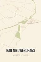 Retro plattegrond van Bad Nieuweschans, gelegen in de gemeente Oldambt, provincie Groningen. Op de landkaart zijn de openbare wegen, waterlopen (meren, beken en sloten) en bossen in en rondom Bad Nieuweschans weergeven. Verder is de kaart voorzien van de coördinaten van Bad Nieuweschans.