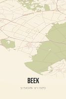 Retro plattegrond van Beek, gelegen in de Liemers, in de gemeente Montferland, provincie Gelderland. Op de landkaart zijn de openbare wegen, waterlopen (meren, beken en sloten) en bossen in en rondom Beek weergeven. Verder is de kaart voorzien van de coördinaten van Beek.
