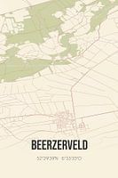 Retro plattegrond van Beerzerveld, gelegen in de gemeente Ommen, provincie Overijssel. Op de landkaart zijn de openbare wegen, waterlopen (meren, beken en sloten) en bossen in en rondom Beerzerveld weergeven. Verder is de kaart voorzien van de coördinaten van Beerzerveld.