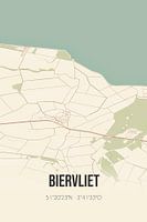 Retro plattegrond van Biervliet, gelegen in de gemeente Terneuzen, provincie Zeeland. Op de landkaart zijn de openbare wegen, waterlopen (meren, beken en sloten) en bossen in en rondom Biervliet weergeven. Verder is de kaart voorzien van de coördinaten van Biervliet.
