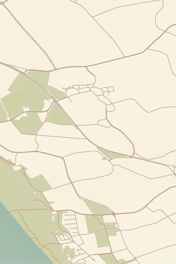 Retro plattegrond van Biggekerke, gelegen in de gemeente Veere, provincie Zeeland. Op de landkaart zijn de openbare wegen, waterlopen (meren, beken en sloten) en bossen in en rondom Biggekerke weergeven. Verder is de kaart voorzien van de coördinaten van Biggekerke.