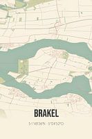 Retro plattegrond van Brakel, gelegen in de Betuwe, in de gemeente Zaltbommel, provincie Gelderland. Op de landkaart zijn de openbare wegen, waterlopen (meren, beken en sloten) en bossen in en rondom Brakel weergeven. Verder is de kaart voorzien van de coördinaten van Brakel.