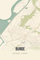 Retro plattegrond van Bunde, gelegen in de gemeente Meerssen, provincie Limburg. Op de landkaart zijn de openbare wegen, waterlopen (meren, beken en sloten) en bossen in en rondom Bunde weergeven. Verder is de kaart voorzien van de coördinaten van Bunde.