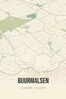 Retro plattegrond van Buurmalsen, gelegen in de Betuwe, in de gemeente West Betuwe, provincie Gelderland. Op de landkaart zijn de openbare wegen, waterlopen (meren, beken en sloten) en bossen in en rondom Buurmalsen weergeven. Verder is de kaart voorzien van de coördinaten van Buurmalsen.