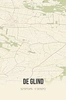 Retro plattegrond van De Glind, gelegen op de Veluwe, in de gemeente Barneveld, provincie Gelderland. Op de landkaart zijn de openbare wegen, waterlopen (meren, beken en sloten) en bossen in en rondom De Glind weergeven. Verder is de kaart voorzien van de coördinaten van De Glind.