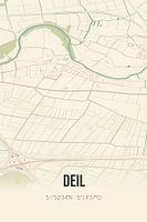 Retro plattegrond van Deil, gelegen in de Betuwe, in de gemeente West Betuwe, provincie Gelderland. Op de landkaart zijn de openbare wegen, waterlopen (meren, beken en sloten) en bossen in en rondom Deil weergeven. Verder is de kaart voorzien van de coördinaten van Deil.