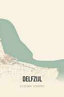 Retro plattegrond van Delfzijl, gelegen in de gemeente Delfzijl, provincie Groningen. Op de landkaart zijn de openbare wegen, waterlopen (meren, beken en sloten) en bossen in en rondom Delfzijl weergeven. Verder is de kaart voorzien van de coördinaten van Delfzijl.