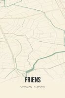 Retro plattegrond van Friens, gelegen in de gemeente Leeuwarden, provincie Fryslan. Op de landkaart zijn de openbare wegen, waterlopen (meren, beken en sloten) en bossen in en rondom Friens weergeven. Verder is de kaart voorzien van de coördinaten van Friens.