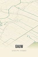 Retro plattegrond van Gauw, gelegen in de gemeente Sudwest-Fryslan, provincie Fryslan. Op de landkaart zijn de openbare wegen, waterlopen (meren, beken en sloten) en bossen in en rondom Gauw weergeven. Verder is de kaart voorzien van de coördinaten van Gauw.