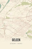 Retro plattegrond van Geleen, gelegen in de gemeente Sittard-Geleen, provincie Limburg. Op de landkaart zijn de openbare wegen, waterlopen (meren, beken en sloten) en bossen in en rondom Geleen weergeven. Verder is de kaart voorzien van de coördinaten van Geleen.