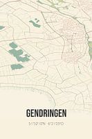 Retro plattegrond van Gendringen, gelegen in de Liemers, in de gemeente Oude IJsselstreek, provincie Gelderland. Op de landkaart zijn de openbare wegen, waterlopen (meren, beken en sloten) en bossen in en rondom Gendringen weergeven. Verder is de kaart voorzien van de coördinaten van Gendringen.