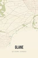 Retro plattegrond van Glane, gelegen in Twente, in de gemeente Losser, provincie Overijssel. Op de landkaart zijn de openbare wegen, waterlopen (meren, beken en sloten) en bossen in en rondom Glane weergeven. Verder is de kaart voorzien van de coördinaten van Glane.