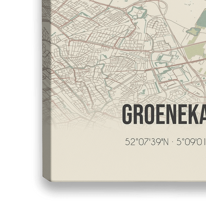 Retro plattegrond van Groenekan, gelegen in de gemeente De Bilt, provincie Utrecht. Op de landkaart zijn de openbare wegen, waterlopen (meren, beken en sloten) en bossen in en rondom Groenekan weergeven. Verder is de kaart voorzien van de coördinaten van Groenekan.