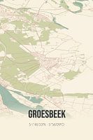 Retro plattegrond van Groesbeek, gelegen in regio Rivierenland, in de gemeente Berg en Dal, provincie Gelderland. Op de landkaart zijn de openbare wegen, waterlopen (meren, beken en sloten) en bossen in en rondom Groesbeek weergeven. Verder is de kaart voorzien van de coördinaten van Groesbeek.