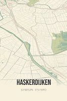 Retro plattegrond van Haskerdijken, gelegen in de gemeente Heerenveen, provincie Fryslan. Op de landkaart zijn de openbare wegen, waterlopen (meren, beken en sloten) en bossen in en rondom Haskerdijken weergeven. Verder is de kaart voorzien van de coördinaten van Haskerdijken.
