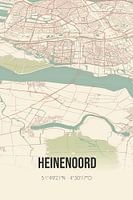 Retro plattegrond van Heinenoord, gelegen in de gemeente Hoeksche Waard, provincie Zuid-Holland. Op de landkaart zijn de openbare wegen, waterlopen (meren, beken en sloten) en bossen in en rondom Heinenoord weergeven. Verder is de kaart voorzien van de coördinaten van Heinenoord.