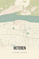 Retro plattegrond van Heteren, gelegen in de Betuwe, in de gemeente Overbetuwe, provincie Gelderland. Op de landkaart zijn de openbare wegen, waterlopen (meren, beken en sloten) en bossen in en rondom Heteren weergeven. Verder is de kaart voorzien van de coördinaten van Heteren.