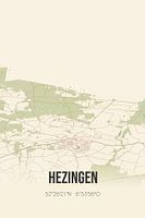 Retro plattegrond van Hezingen, gelegen in Twente, in de gemeente Tubbergen, provincie Overijssel. Op de landkaart zijn de openbare wegen, waterlopen (meren, beken en sloten) en bossen in en rondom Hezingen weergeven. Verder is de kaart voorzien van de coördinaten van Hezingen.