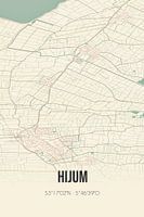Retro plattegrond van Hijum, gelegen in de gemeente Leeuwarden, provincie Fryslan. Op de landkaart zijn de openbare wegen, waterlopen (meren, beken en sloten) en bossen in en rondom Hijum weergeven. Verder is de kaart voorzien van de coördinaten van Hijum.