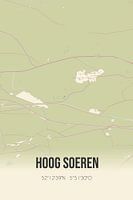 Retro plattegrond van Hoog Soeren, gelegen op de Veluwe, in de gemeente Apeldoorn, provincie Gelderland. Op de landkaart zijn de openbare wegen, waterlopen (meren, beken en sloten) en bossen in en rondom Hoog Soeren weergeven. Verder is de kaart voorzien van de coördinaten van Hoog Soeren.