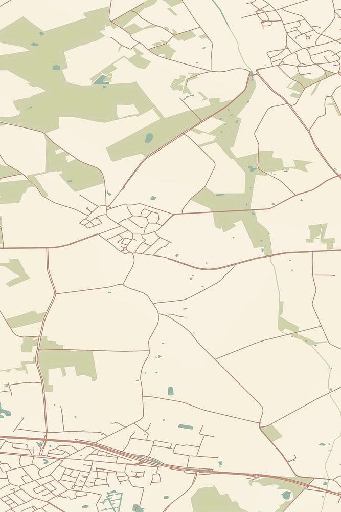 Retro plattegrond van Hoogeloon, gelegen in de gemeente Bladel, provincie Noord-Brabant. Op de landkaart zijn de openbare wegen, waterlopen (meren, beken en sloten) en bossen in en rondom Hoogeloon weergeven. Verder is de kaart voorzien van de coördinaten van Hoogeloon.
