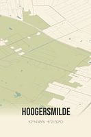 Retro plattegrond van Hoogersmilde, gelegen in de gemeente Westerveld, provincie Drenthe. Op de landkaart zijn de openbare wegen, waterlopen (meren, beken en sloten) en bossen in en rondom Hoogersmilde weergeven. Verder is de kaart voorzien van de coördinaten van Hoogersmilde.