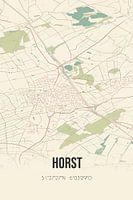 Retro plattegrond van Horst, gelegen in de gemeente Horst aan de Maas, provincie Limburg. Op de landkaart zijn de openbare wegen, waterlopen (meren, beken en sloten) en bossen in en rondom Horst weergeven. Verder is de kaart voorzien van de coördinaten van Horst.
