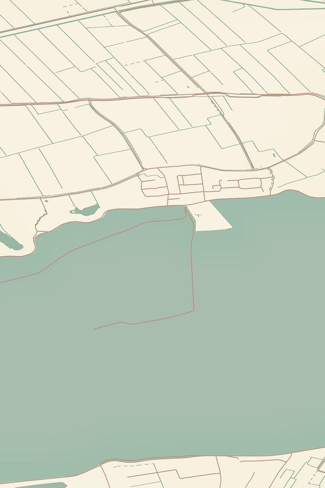 Retro plattegrond van IJzendoorn, gelegen in de Betuwe, in de gemeente Neder-Betuwe, provincie Gelderland. Op de landkaart zijn de openbare wegen, waterlopen (meren, beken en sloten) en bossen in en rondom IJzendoorn weergeven. Verder is de kaart voorzien van de coördinaten van IJzendoorn.