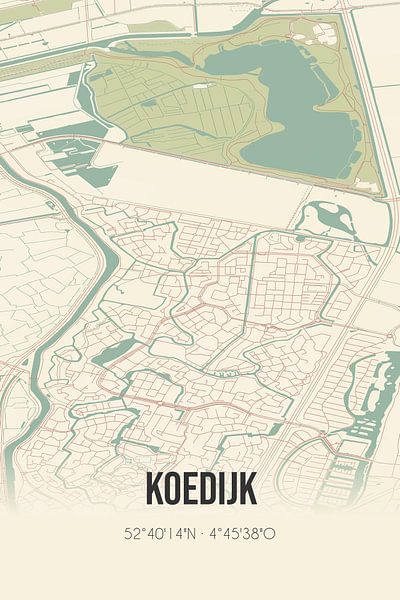 Retro plattegrond van Koedijk, gelegen in de gemeente Alkmaar, provincie Noord-Holland. Op de landkaart zijn de openbare wegen, waterlopen (meren, beken en sloten) en bossen in en rondom Koedijk weergeven. Verder is de kaart voorzien van de coördinaten van Koedijk.